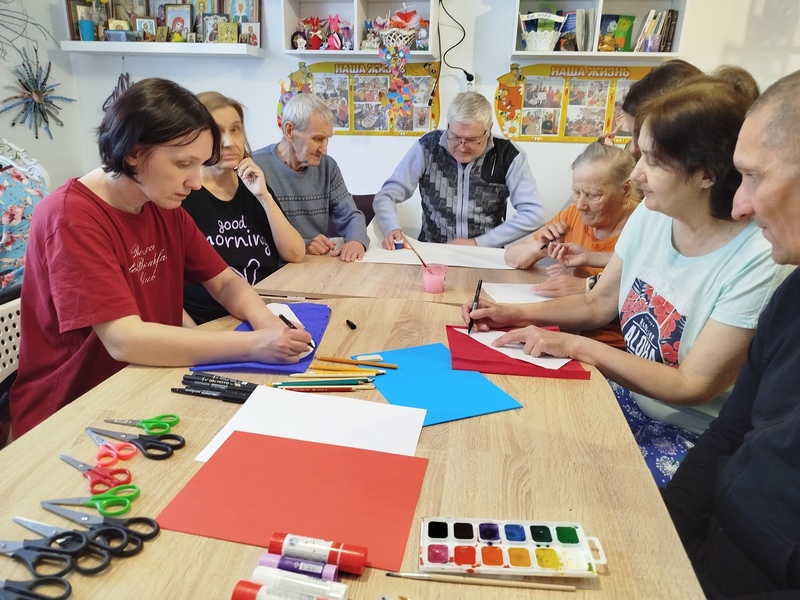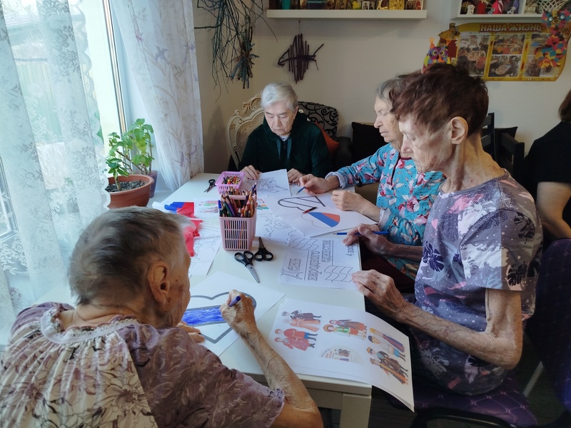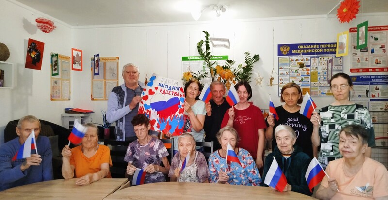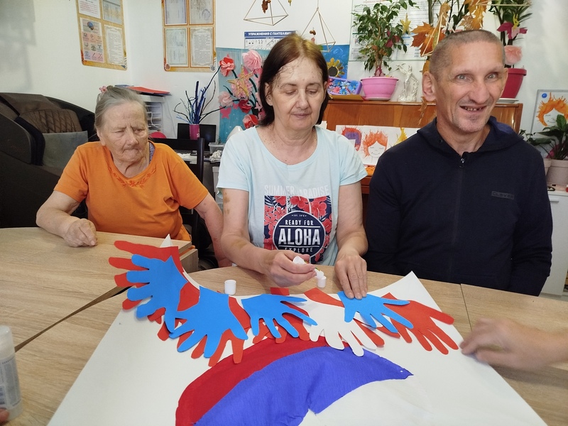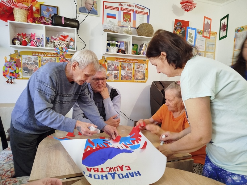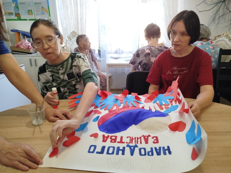 Кульминацией праздника стало создание общего плаката, символизирующего единство и дружбу. Под чутким руководством педагога, наши постояльцы с энтузиазмом принялись за работу, используя яркую бумагу, краски, кисти и фантазию. Каждый внес свой вклад в создание этого красочного произведения искусства.