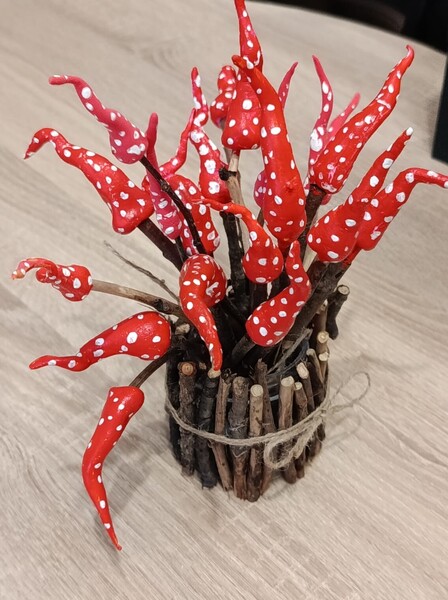 Мы начали с подготовки основы: небольшого горшочка, наполненного пенопластом для устойчивости. Затем приступили к самому увлекательному – лепке грибочков. Красные шляпки с белыми крапинками, аккуратные ножки, словно сошедшие со страниц детской сказки, – каждый мухомор получался уникальным и неповторимым.